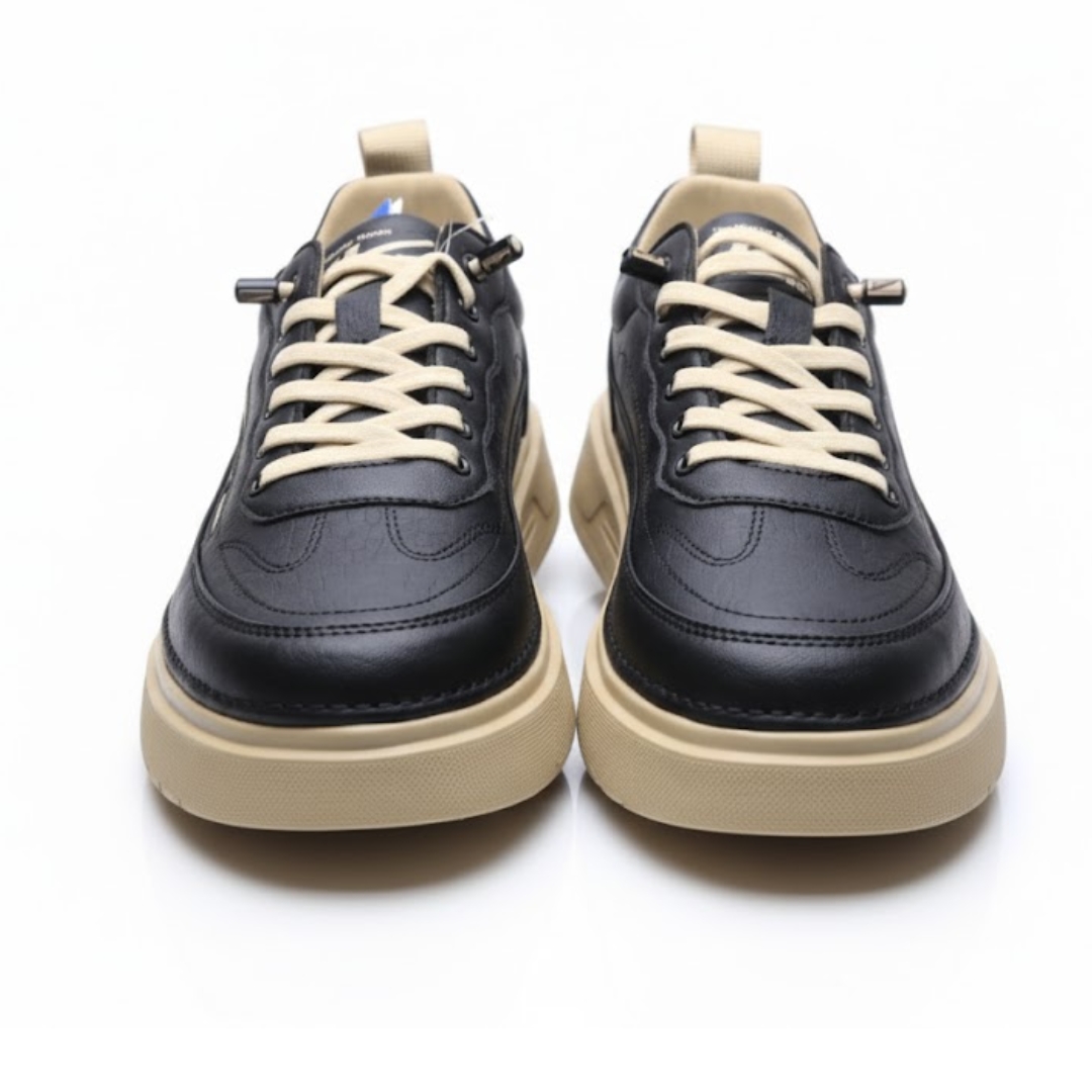 casual leather sneaker, black beige shoes, premium lifestyle sneaker, everyday comfort shoe, stylish men footwear, office casual shoes