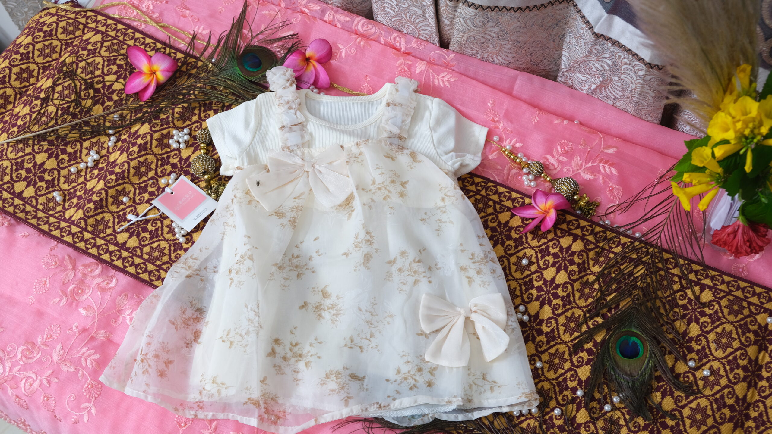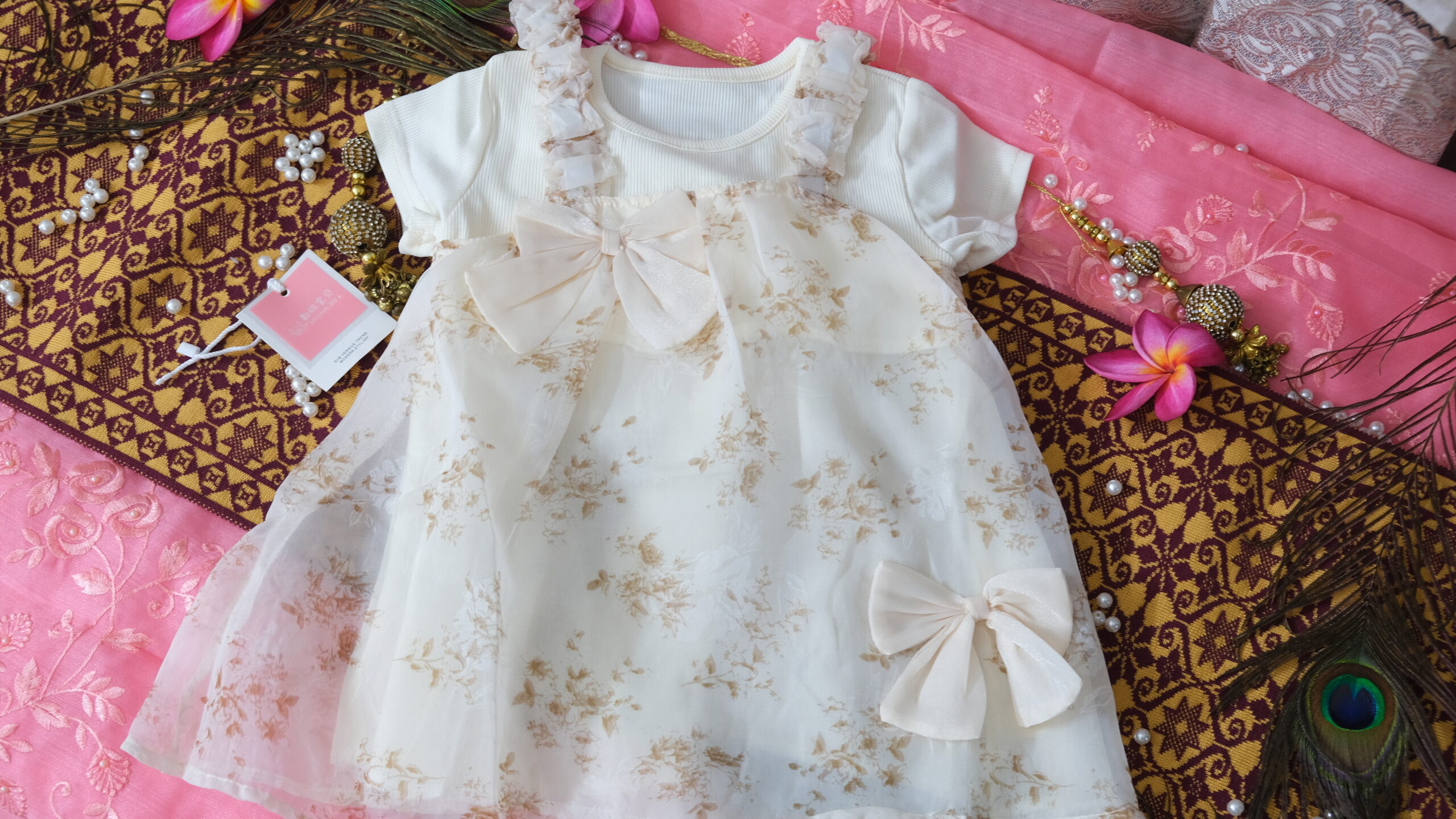 A soft ivory boutique baby dress featuring delicate floral prints, layered bow details, and a graceful vintage-inspired silhouette.