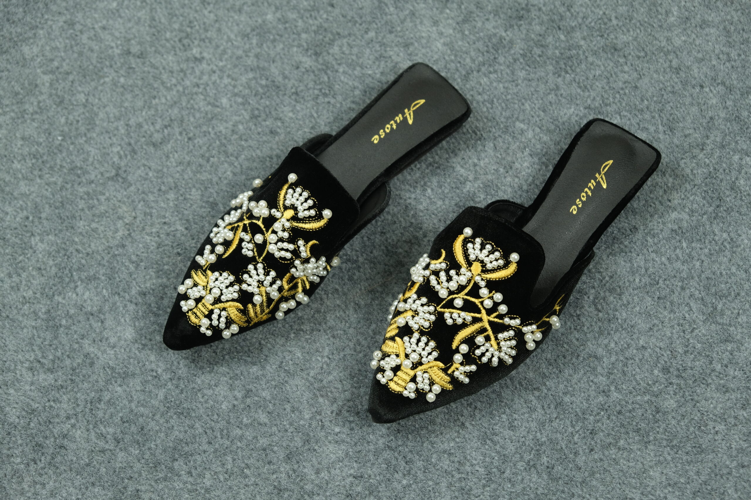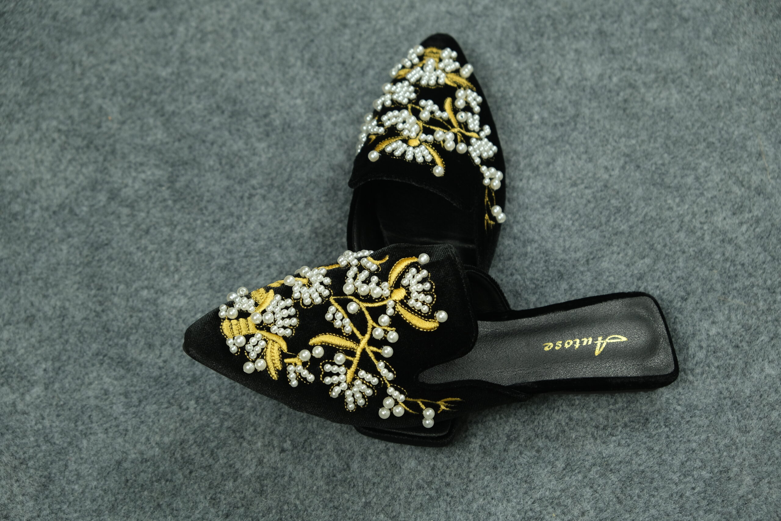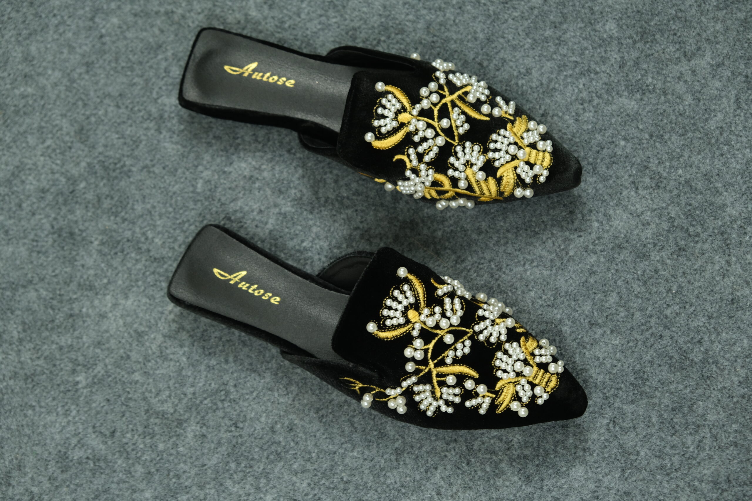 Luxury Pearl Embroidered Pointed Mule Flats – Elegant Women Slip-On Shoes । Code – ZCSN32