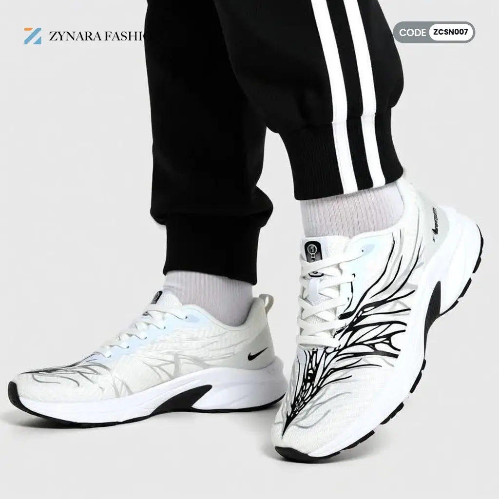 The Zynara AeroStrike Graphic Runner – ZCSN007 is built for speed, control, and visual impact. Designed with a sleek white upper and sharp black graphic detailing, this runner delivers a bold athletic look inspired by motion and energy. The lightweight construction allows effortless movement, while the cushioned midsole absorbs impact to keep every stride smooth and responsive.
