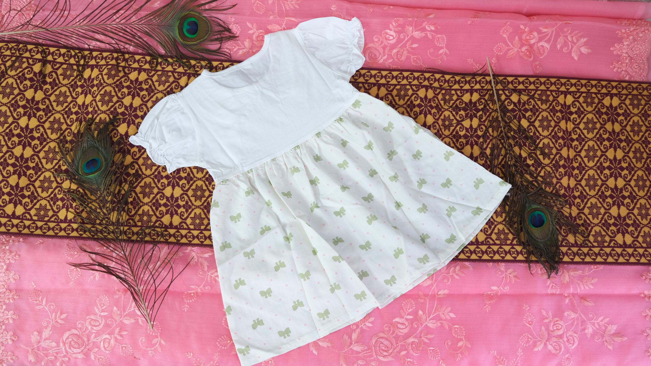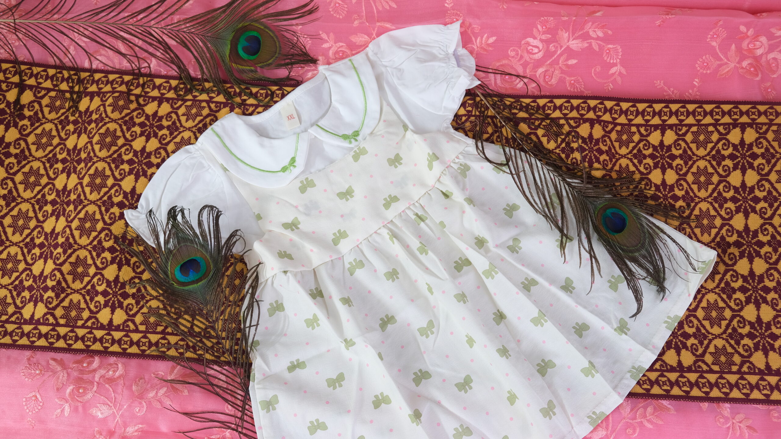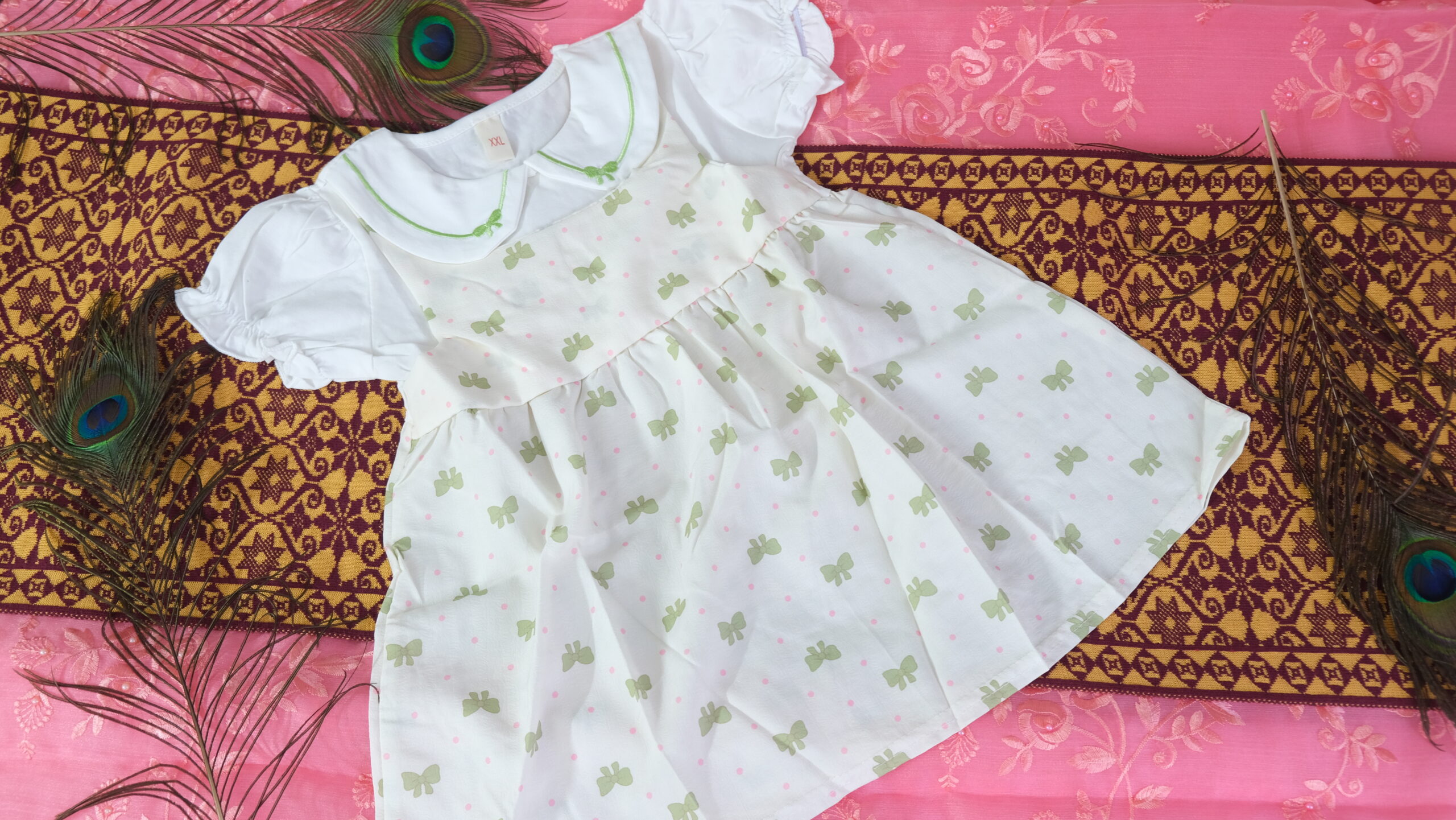 A soft boutique girls’ dress featuring a graceful Peter Pan collar, delicate sage bow prints, and an airy silhouette for a timeless everyday look.