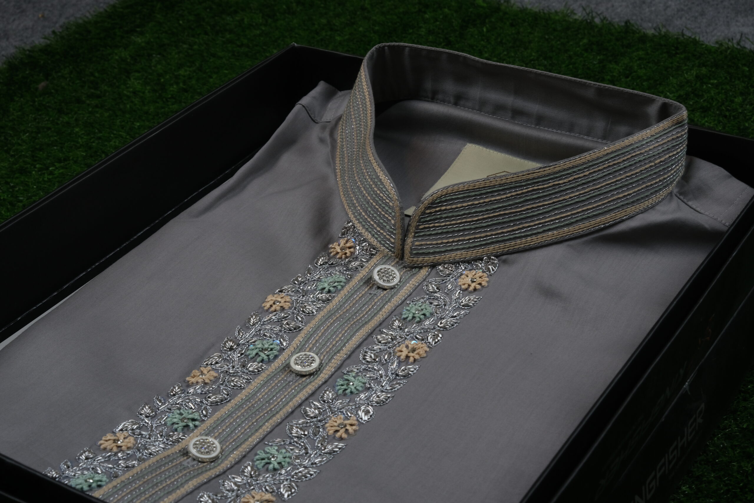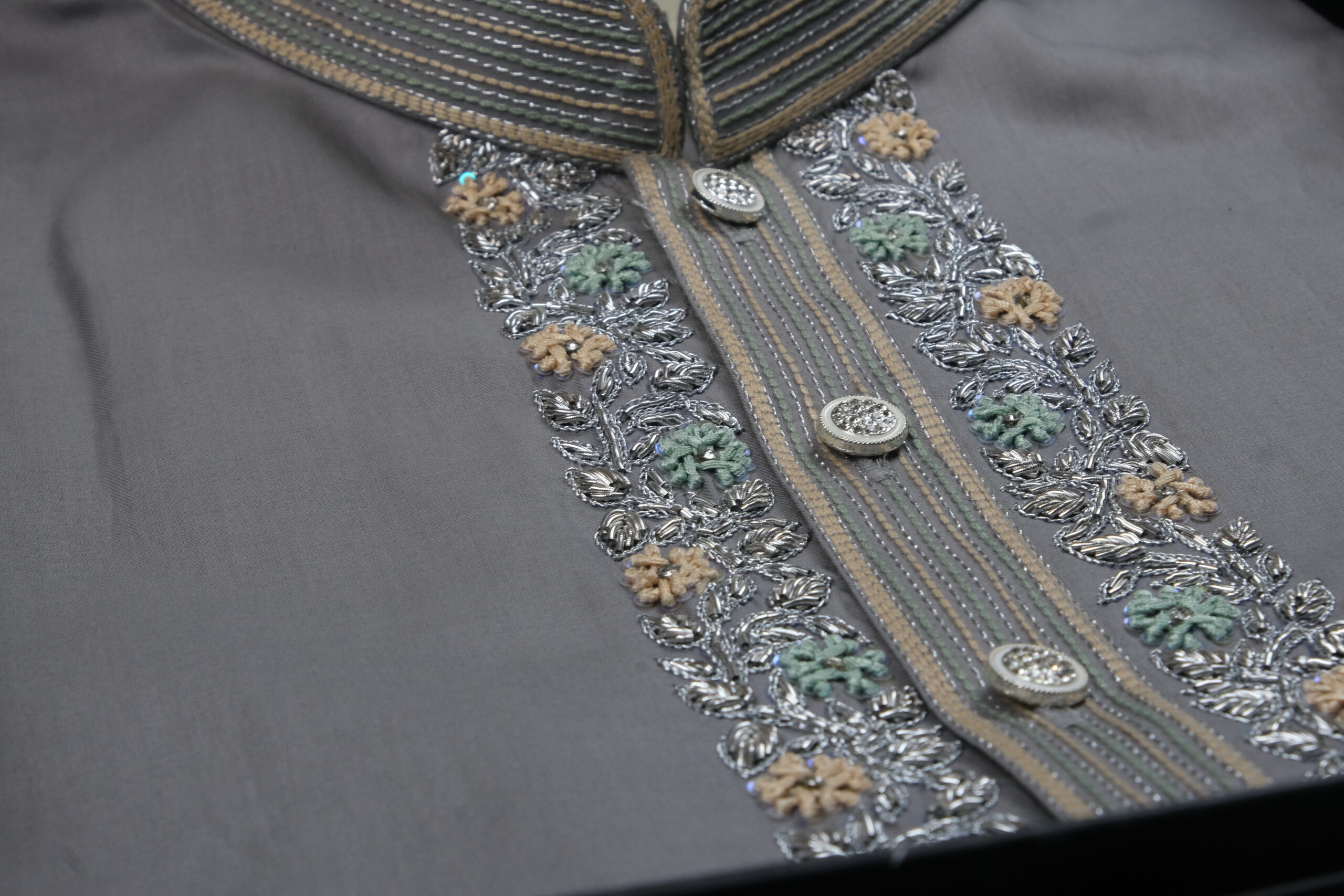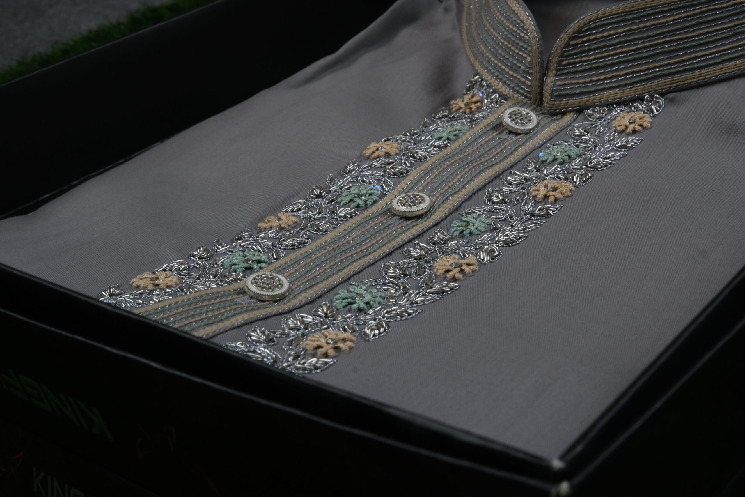The structured neckline is finished with layered stitch detailing, while custom heritage-inspired metal buttons add a quiet sense of distinction.
