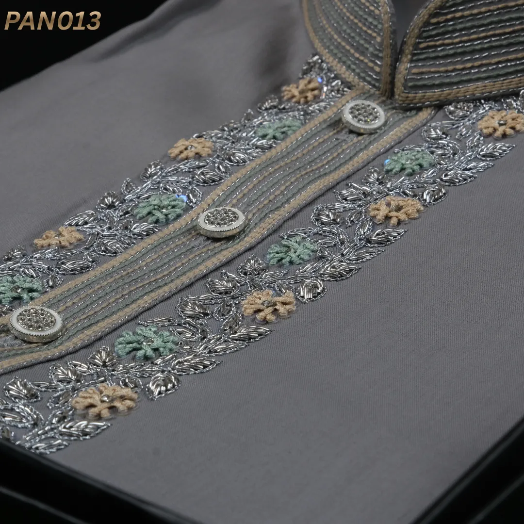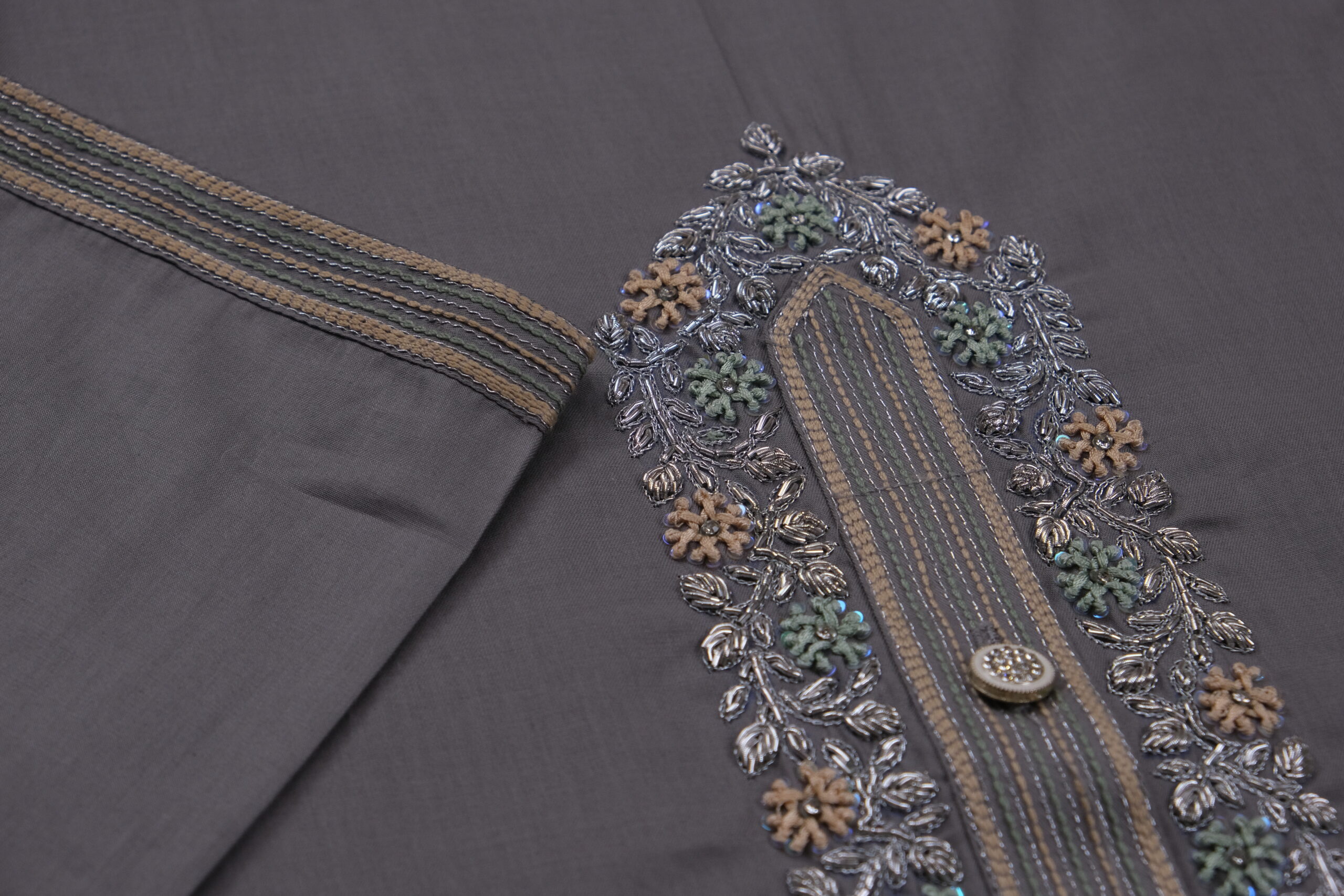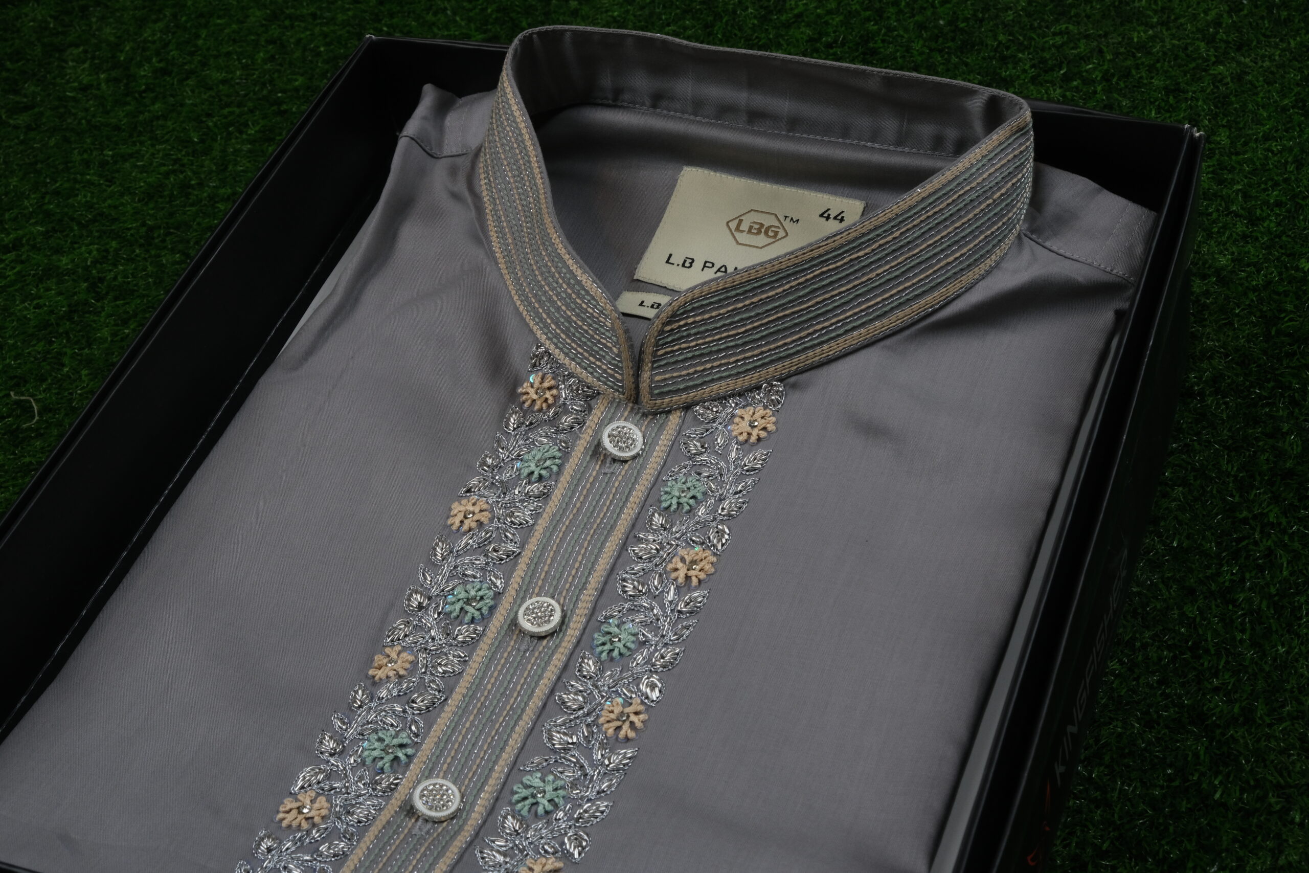 The structured neckline is finished with layered stitch detailing, while custom heritage-inspired metal buttons add a quiet sense of distinction.
