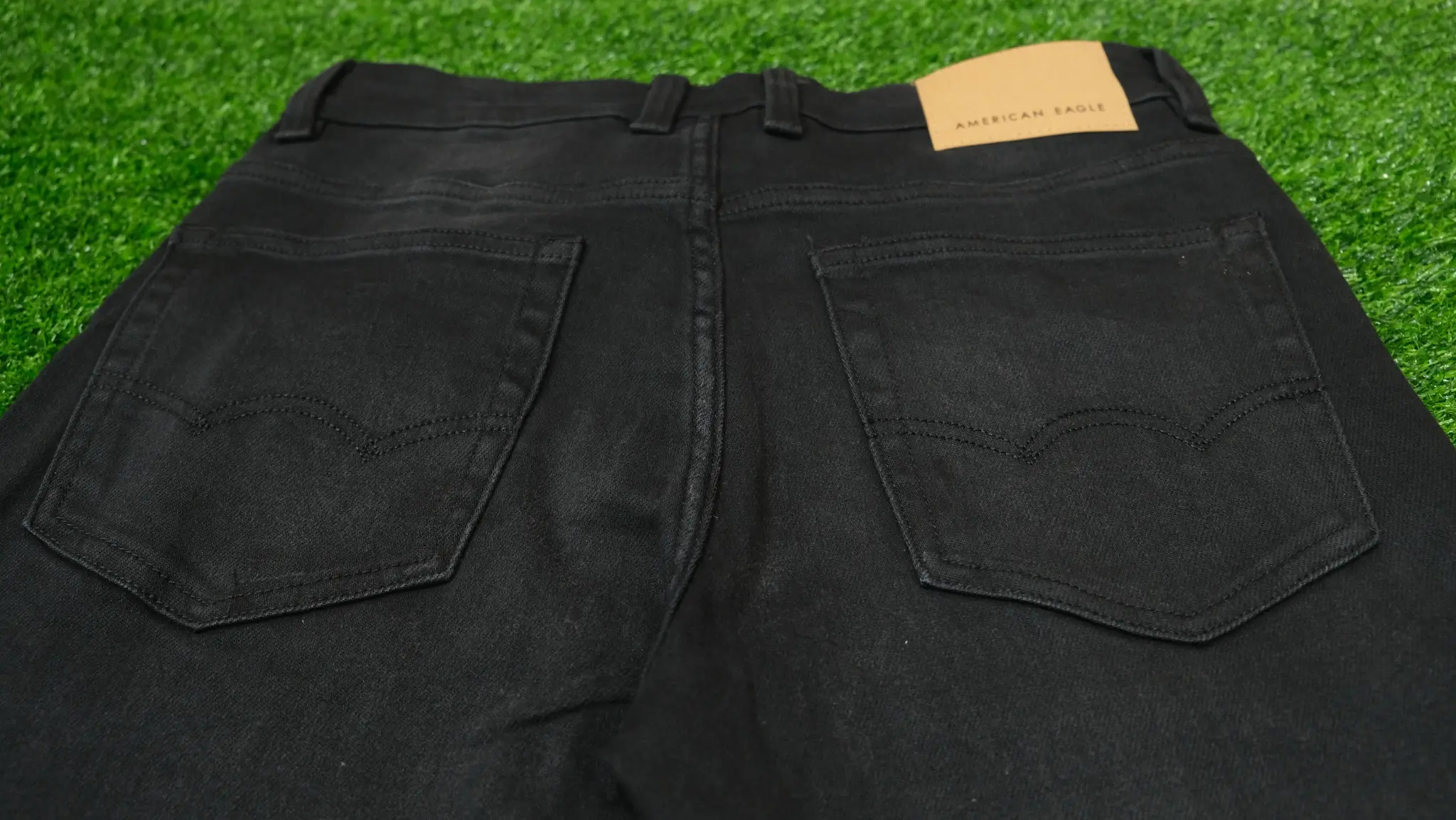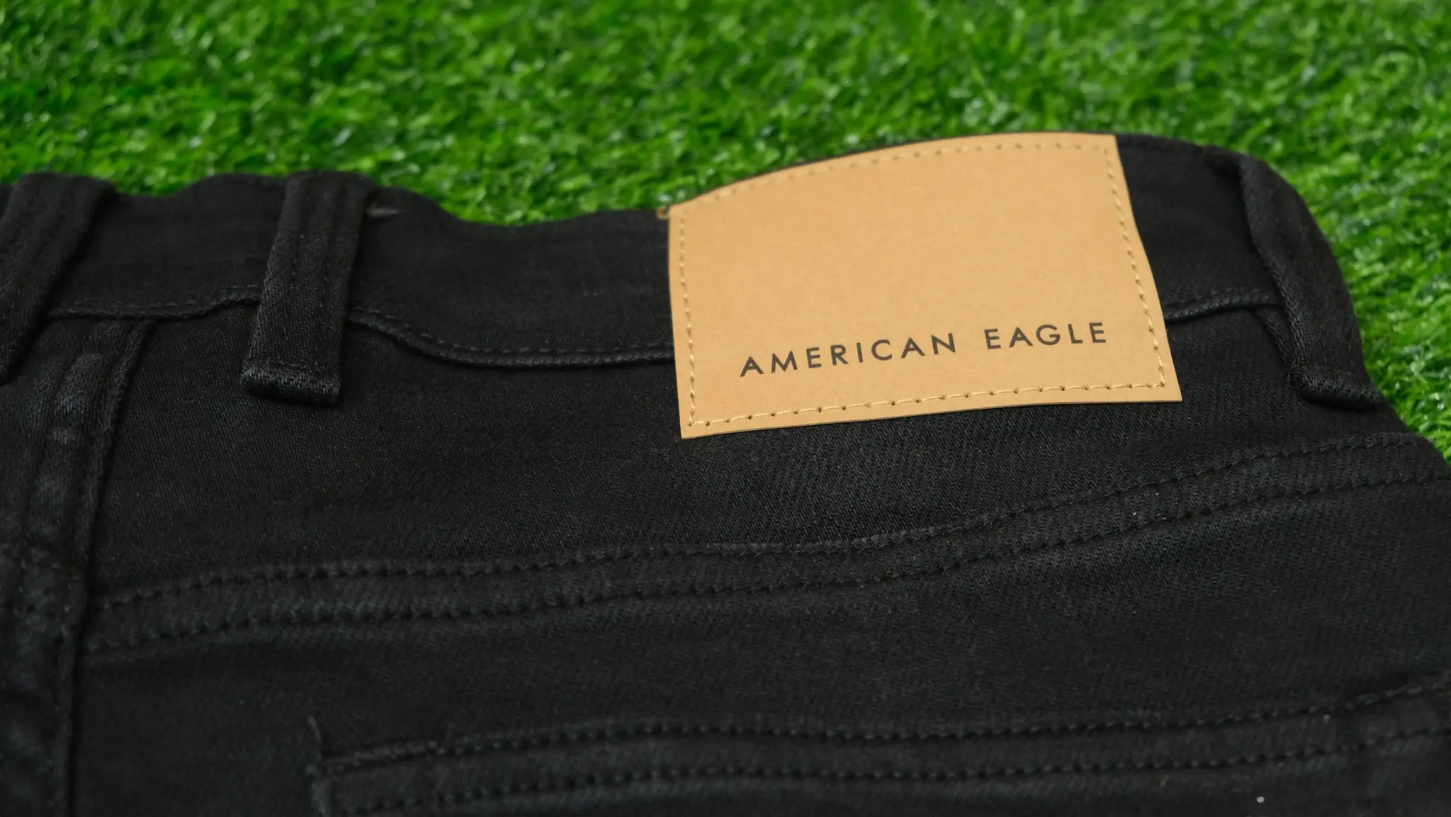 American Eagle slim-fit denim jeans often use knit denim and cotton-blend fabric for softness and flexibility.