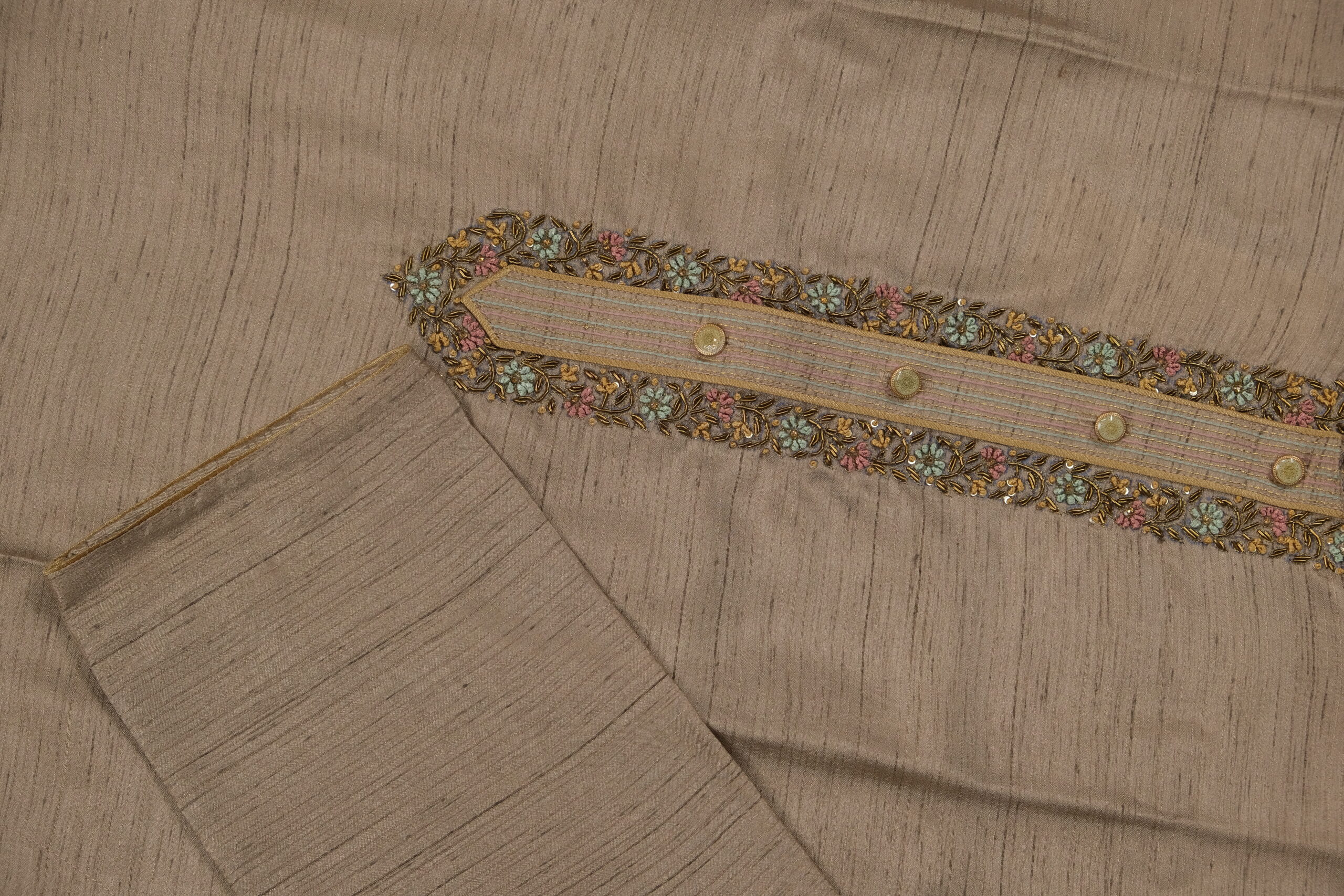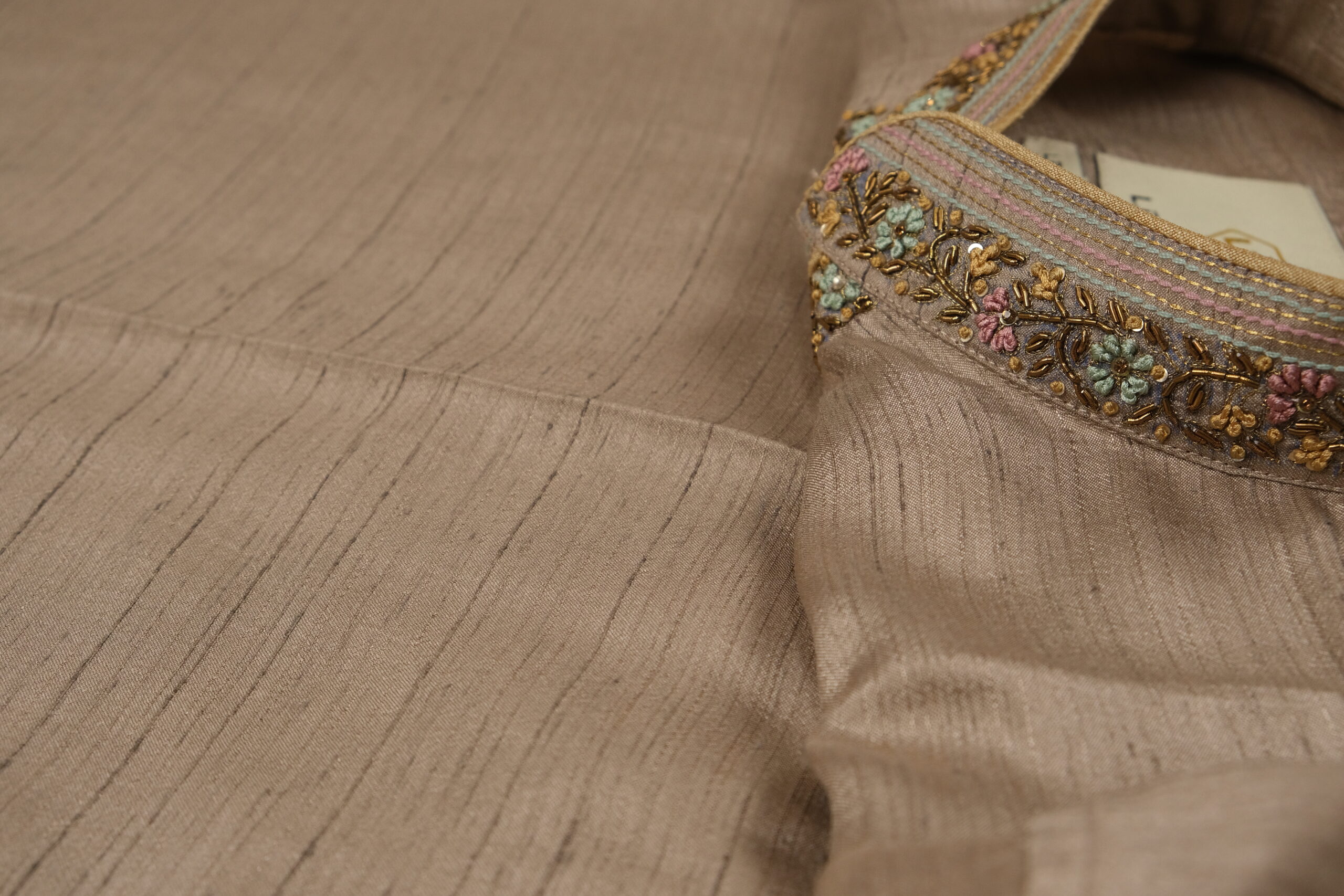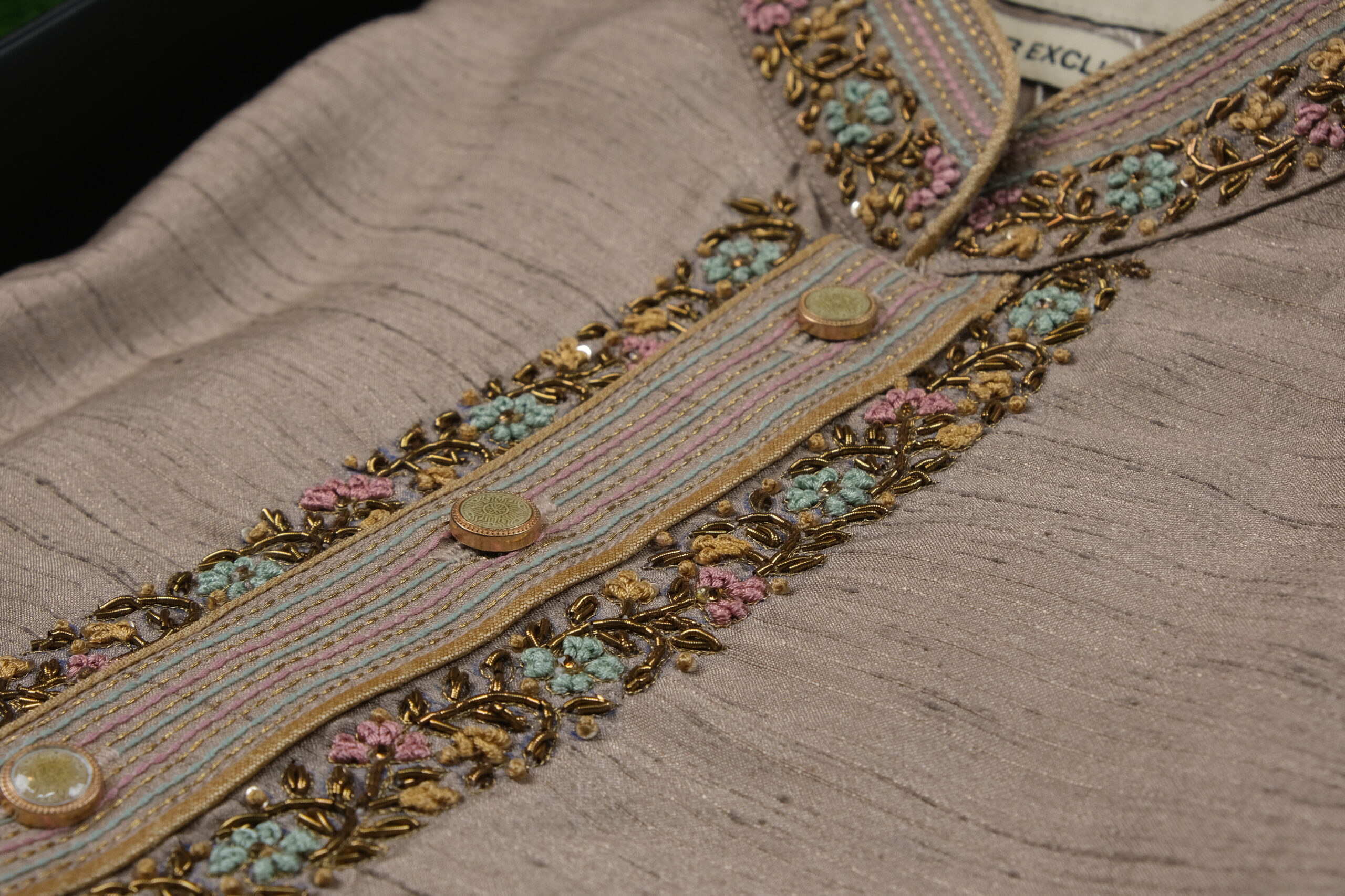 The embroidery flows organically, creating a refined visual rhythm that feels decorative yet compos.